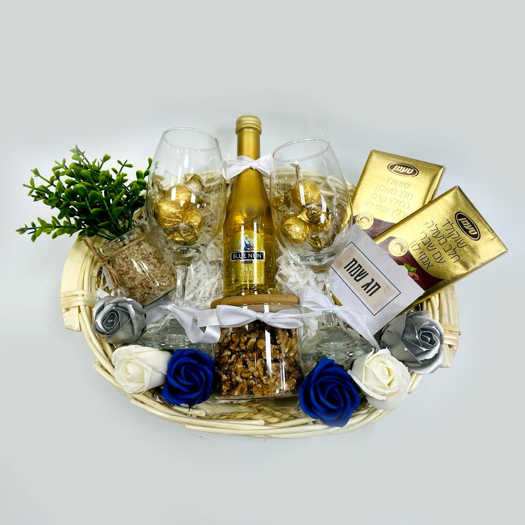 בלו נאן מבעבע 200 מ"ל 24 קראט 2 כוסות יין מלאות בשוקולדים 2 שוקולד חלב מהודר עציץ אביבי לקישוט אגוזים בצנצנת זכוכית מהודרת 6 פרחי סבון ריחניים